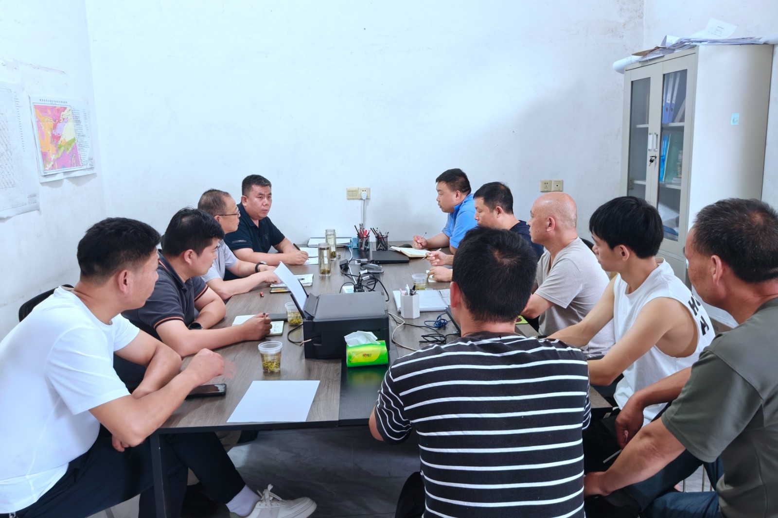 為北溝項目野外一線職工送來了防暑慰問品后,司金強一行聽取了項目負責人孫德對項目基本情況及最新找礦成果匯報,王朋對項目技術資料質量進行全面檢查,對做好第一期野外驗收工作提出了要求,要提高工作效率,狠抓項目進度,嚴把質量關,及時整理項目資料。安保部重點對近期嚴峻的防汛工作及項目外包作業進行安全檢查,強調了近期防汛工作的重要性,要時刻關注天氣情況及地質災害預警信息,做好防汛預案和人員職責分配,通過檢查指出了外包作業資料不全等問題,要求項目部及時整改。行政部重點強調資料保密工作,提高保密工作意識,嚴禁網上傳送保密文件,加強資料管理,要求資料及時歸檔,加強車輛管理,公車使用嚴格執行公司規章制度,嚴禁公車私用。