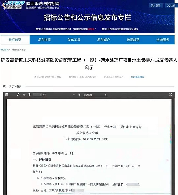 9月8日,通過陜西采購與招標網(wǎng)公示信息獲悉,公司參與競爭性磋商的“延安高新區(qū)未來科技城基礎(chǔ)設(shè)施配套工程(一期)-污水處理廠項目水土保持方案”,經(jīng)評標小組專家審定,被確定為第一中標候選人。