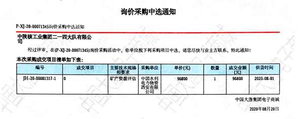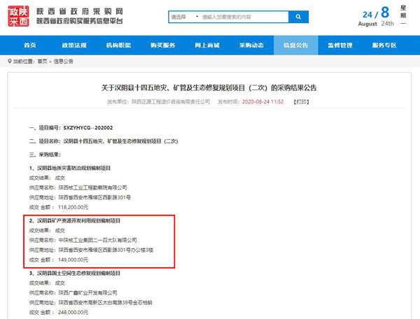 8月24日,從陜西省政府采購網、中國大唐商務電子平臺分別獲悉,公司成功中標《漢陰縣礦產資源開發利用規劃編制》及《大唐城固50MW農光互補光伏發電項目及送出線路壓覆礦產資源評估》項目。