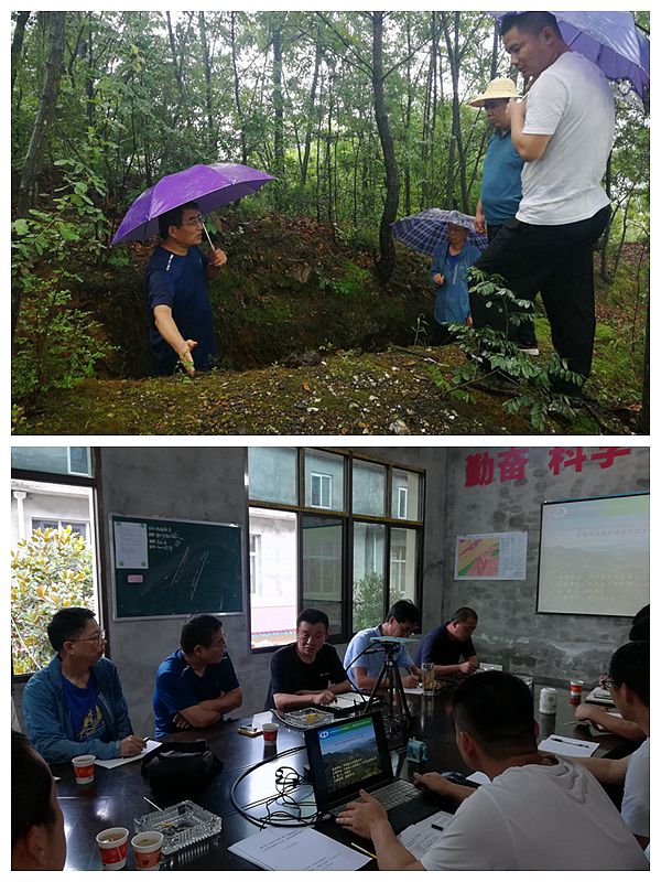 到達項目部后,李靠社一行聽取了項目負責人對項目工作進展及找礦成果的匯報,冒雨前往野外對重要地質(zhì)路線及重點見礦探槽進行了檢查,并與項目技術人員進行了現(xiàn)場交流。在項目部,檢查組對地質(zhì)填圖、剖面及探槽原始資料進行了詳細查閱,對項目取得的成果表示肯定,同時針對資料中存在的問題與技術人員進行了探討與交流,并提出了意見及建議,一是編繪全區(qū)鉆孔柱狀圖,確定含錳地層層序;二是分析含錳巖系沉積相特征、沉積環(huán)境特征,確定找礦標志,為工程揭露工作提供依據(jù);三是對原始資料存在的問題及時整改,加強綜合整理,及時對已有資料進行總結歸納;四是對項目資料中存在的問題進行深刻剖析,并加強地質(zhì)基礎資料整理與研究;五是加強與武警黃金支隊項目交流,促進項目找礦工作。