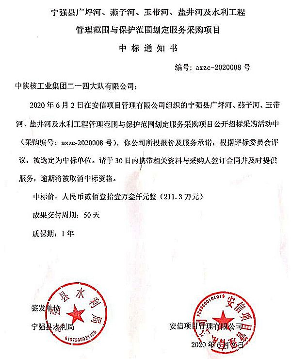 6月5日,從招標公司獲悉,公司成功中標“寧強縣廣坪河、燕子河、玉帶河、鹽井河管理范圍和保護范圍劃定項目”。