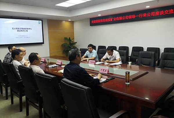 鄧盛波首先對況鍋明一行的到來表示熱烈歡迎,介紹了公司近況及發展思路,航空物探研發中心沈銘成博士對公司無人機航空物探的優勢與技術成果作了匯報。況鍋明也介紹了洛陽有色經投礦業有限公司發展情況,并對無人機航空物探技術應用作了深度交流,隨后雙方對洛陽有色經投礦業公司所屬礦權物探找礦技術方法進行了重點探討,對二一四大隊有限公司提出無人機航空物探方法與地面物探方法結合的初步技術方案給予了肯定。