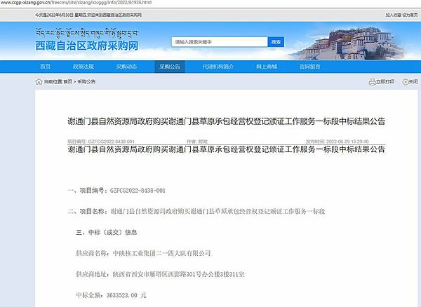 6月29日,公司成功中標西藏自治區(qū)謝通門縣草原承包經(jīng)營權(quán)登記頒證一標段服務(wù)項目,中標金額363.35萬。